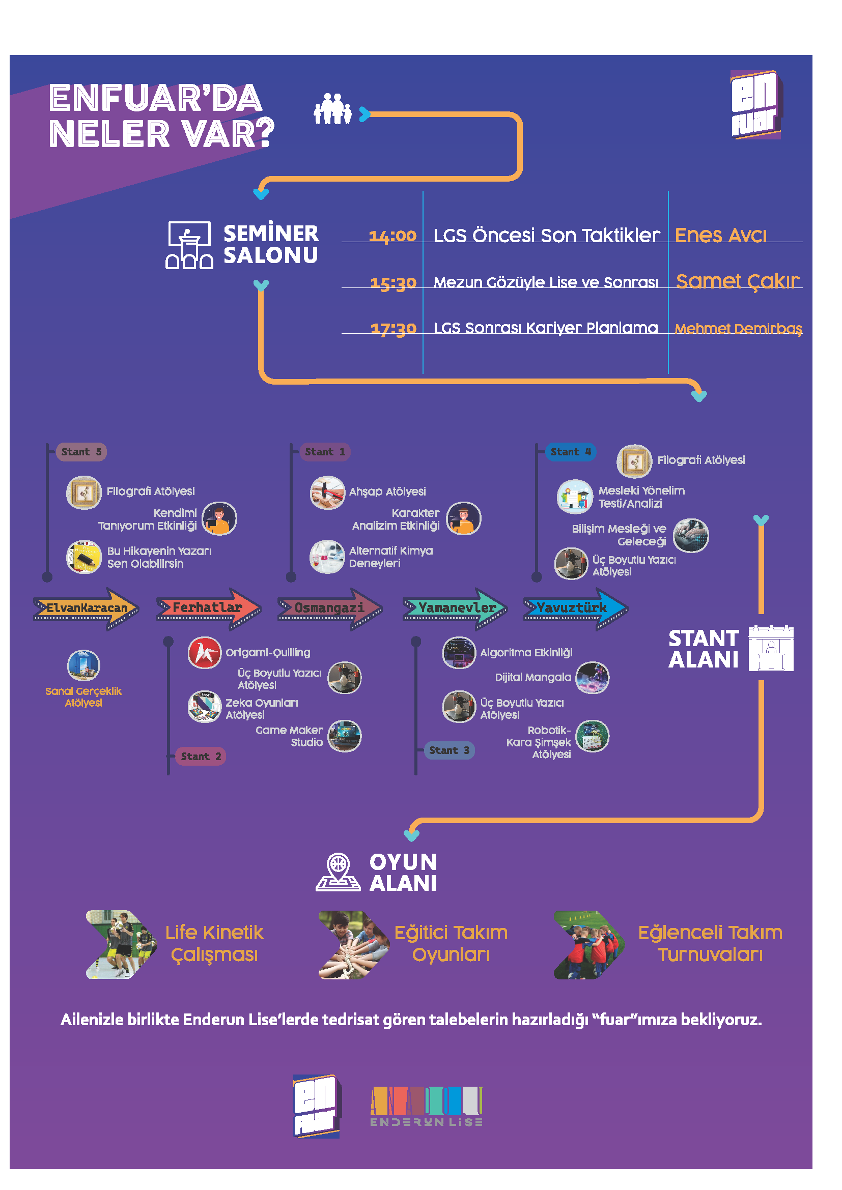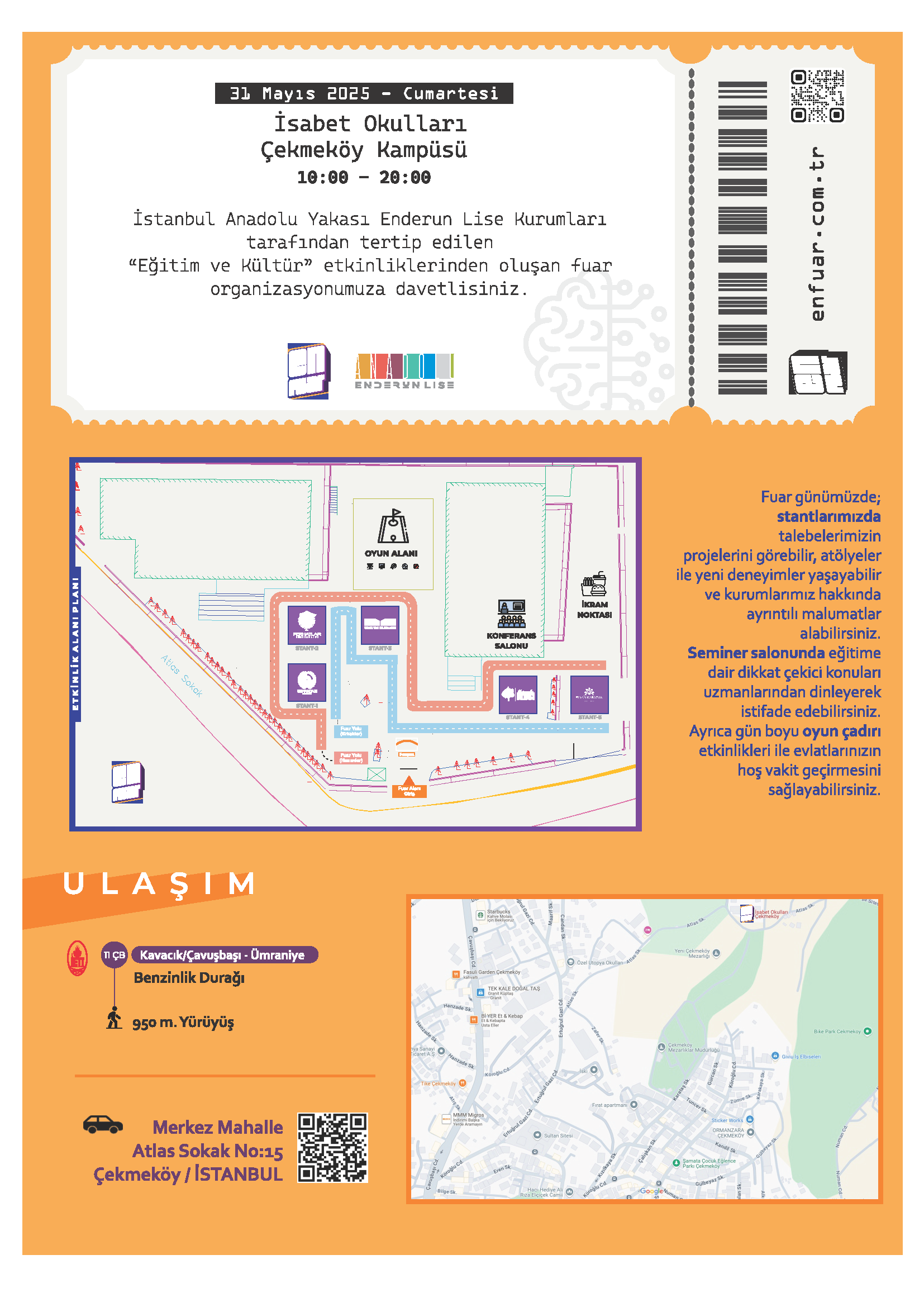 Eğitim fuarına ve proje yarışmamıza hoş geldiniz! Siz değerli katılımcıları burada ağırlamaktan dolayı büyük bir heyecan ve mutluluk duyuyoruz. Bu fuarda, sadece bilgi edinmekle kalmayacak, aynı zamanda çeşitli etkinlikler ve interaktif sunumlarla zenginleşen bir deneyim yaşayacaksınız. Ayrıca, proje yarışmalarındaki talebelerimizin üretici fikirlerini görme şansı da bulacaksınız. Bu nedenle, fuarımızın tadını çıkarırken, yeni bilgiler edinmenin ve potansiyelinizi keşfetmenin keyfini çıkarın.